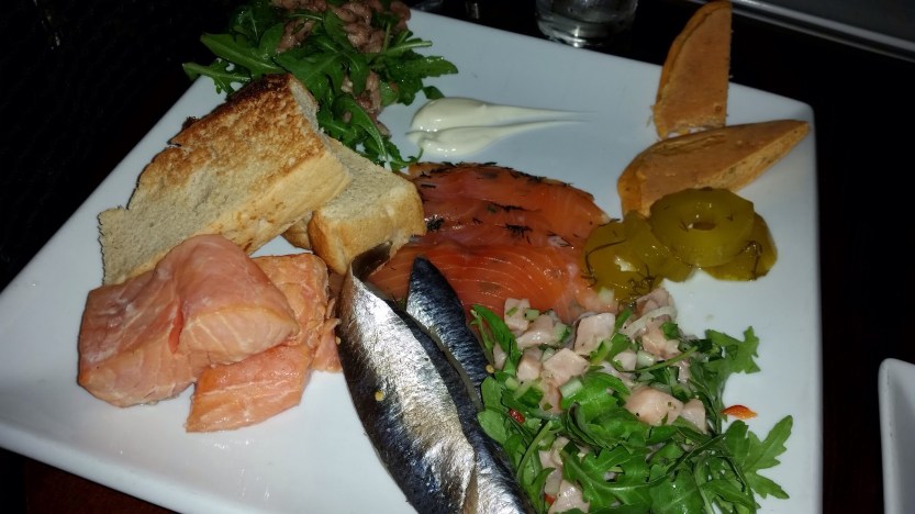 Chilled Scottish Seafood Platter: Lime & ginger hot smoked salmon, sliced gravadlax, damson & gin cured salmon carpaccio of Monkfish, crayfish salsa, pickled sweet onion, brown shrimp & rocket salad, ciabatta bread £10.00 /£19.50 . Are you kidding me? I don’t know why I ordered salmon and monkfish after the best oysters ever. They paled in comparison to the oysters.