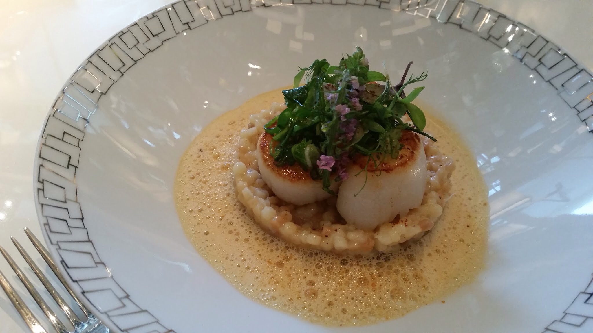 LA SAINT-JACQUES | PAN SEARED SCALLOPS 香煎干貝佐薩丁尼亞麵疙瘩 $720NT or $24USD sweet turnip, fregola, spicy emulsion. As expected! No better and no worse.