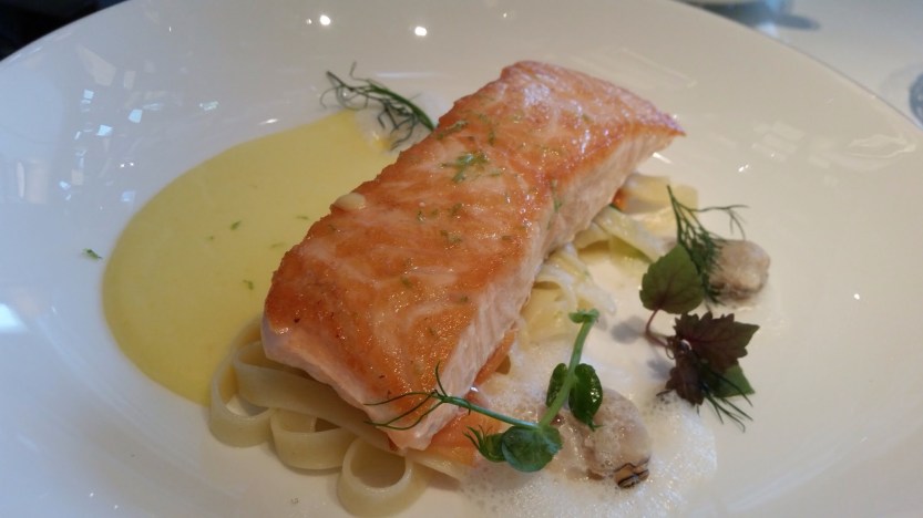 FILET DE SAUMON | SALMON FILLET | 鮭魚佐柚香醬搭鮮蔬扁麵及蛤蜊 Vegetable tagliatelle, carrots, zucchini, clams, yuzu hollandaise