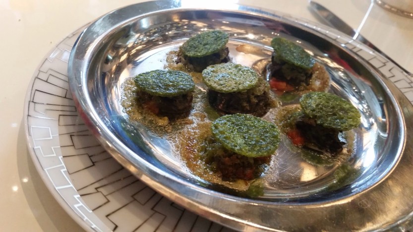 L’ESCARGOT PETIT-GRIS BAKED SNAILS (6 pieces)馬爹拉甜酒奶油烤田螺(六顆) $450NT or $15USD parsley butter and condiments, deglazed with madeira. This was terrible. My ex French mother-in-law does it better. How was it terrible? The escargot were over-baked, too soft and too much butter was used.
