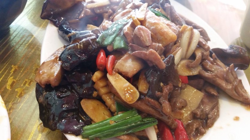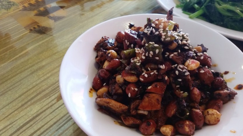 Diced Rabbit with Red Chili Sauce 麻辣兔丁。 This was just bad… The bone was still on the rabbit. The peanuts and the sesame created a weird contrast to the bones – they were all chewy and crunchy just at different levels. If you get a mouth full of bones, peanuts and sesame, your mouth would be confused by the size and the hardness. Your teeth would not know which to chew first because there is no right answer. The peanuts were the best part of the dish. I could not tell that there were rabbit meat involved. It was mostly bone!