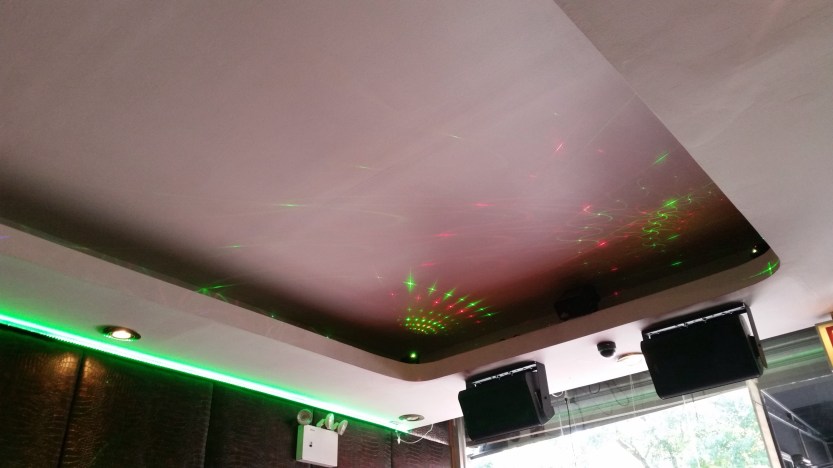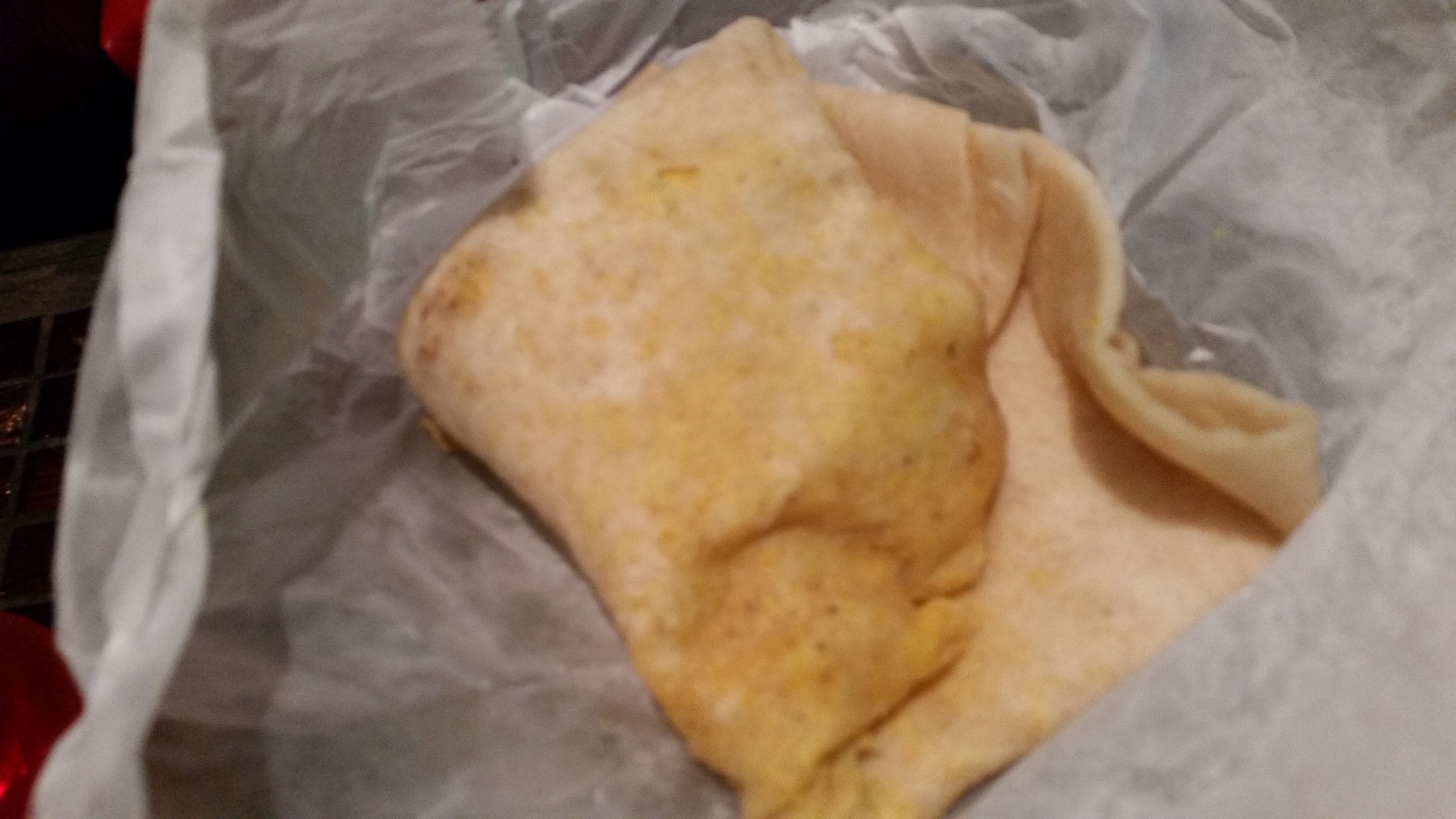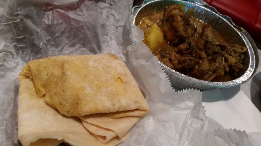 Ali’s Roti Shop is funky, with neon lights for the ceiling and walls and red leatherette booths and ottoman. Em, fyi, the lights were running during a sunny October afternoon while the owner’s young daughter (maybe 5-year-old?) was moving from ottoman to ottoman, playing with her Barbie. This is definitely Brooklyn, NY.
