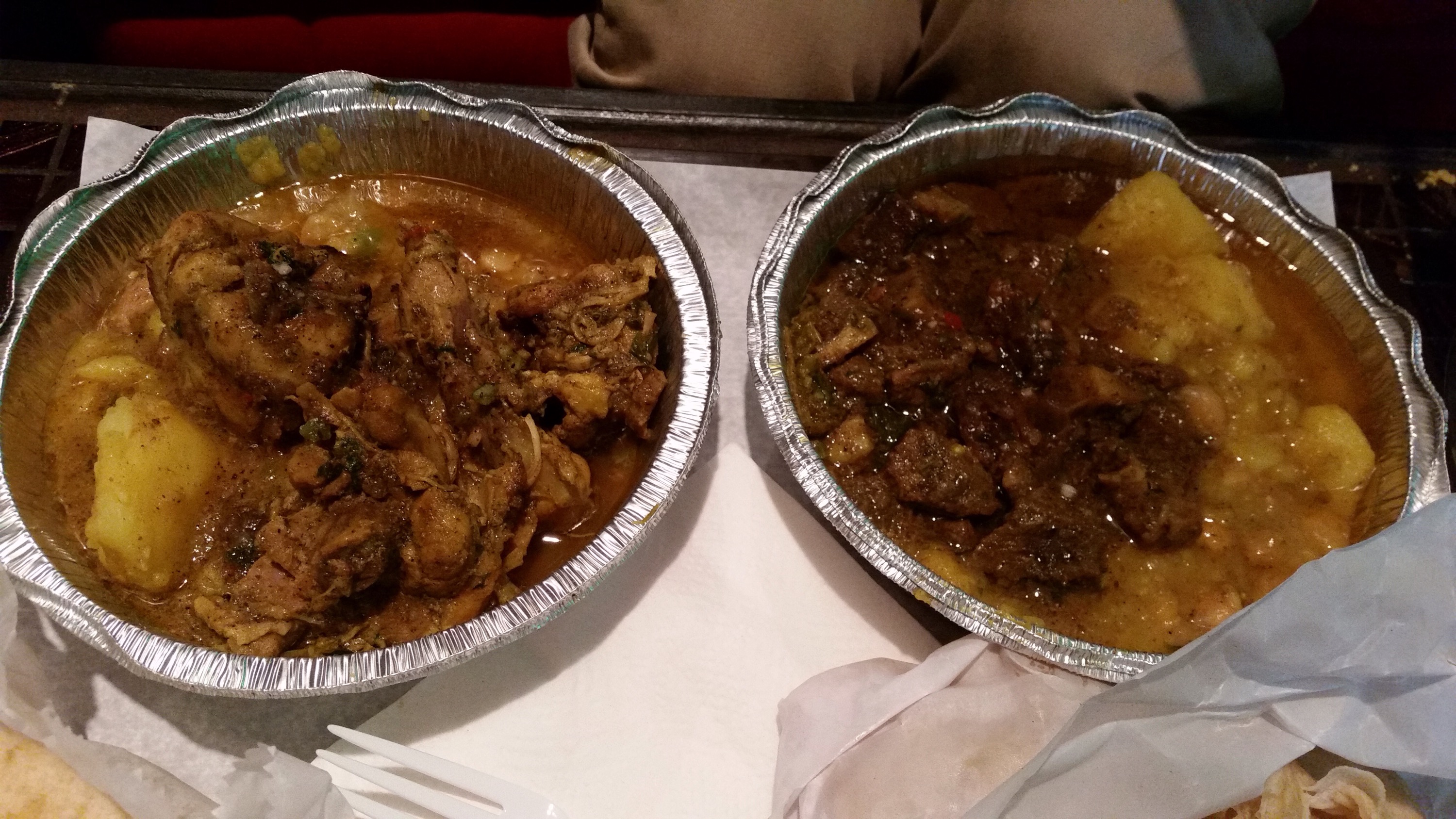 Curried goat and curried chicken. We slathered so much tamarin sauce and spicy sauce on top of these stewed and meat-falling-of-the-bone dishes, eaten with either the buss-up shut or Dhalpuri. It was unreal. It was messy but good. We were using our fingers to dig in and I felt like a child! It was a sensational treat for the mouth and the stomach. It was fulfilling. While I was eating, I kept on thinking how many miles I have to run to burn all the calories off. This is a food fit for the physically active.