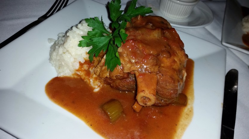 Osso Buco Piemontese: braised and slowly cooked pork shank served in a reduced vegetable wine sauce over homemade risotto. This was an awesome dish. The pork shank was huge with lots of meat that fell off the bone. I ate so much that my utility curve went straight downhill.