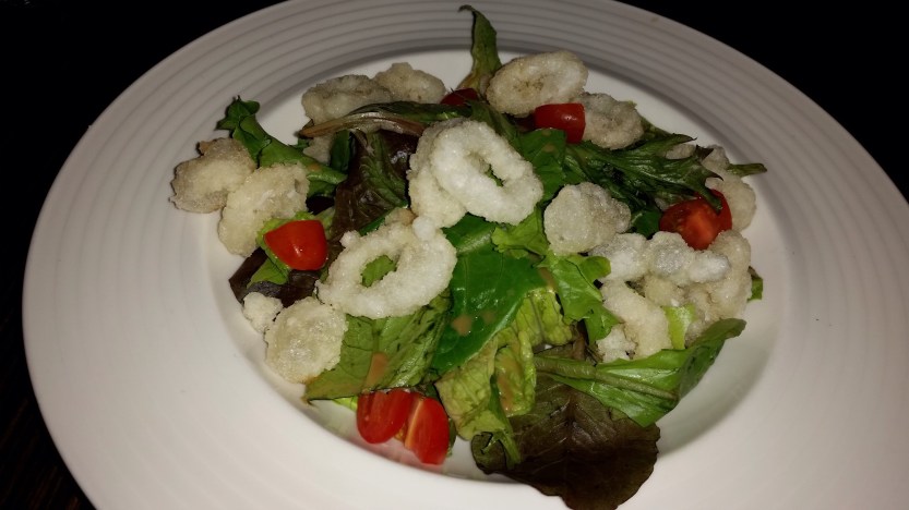 Crispy Calamari Salad with miso vinaigrette dressing. This is truly an Asian fusion dish. The fried calamari is made with a sprinkle of Chinese five spice and Chinese white pepper, the traditional way to prepare Chinese fried calamari. Yet we would never lay crispy calamari on a plate of raw greens, cut up cherry tomatoes and dressing. Regardless, it was delicious. The combination of the east and the west worked.