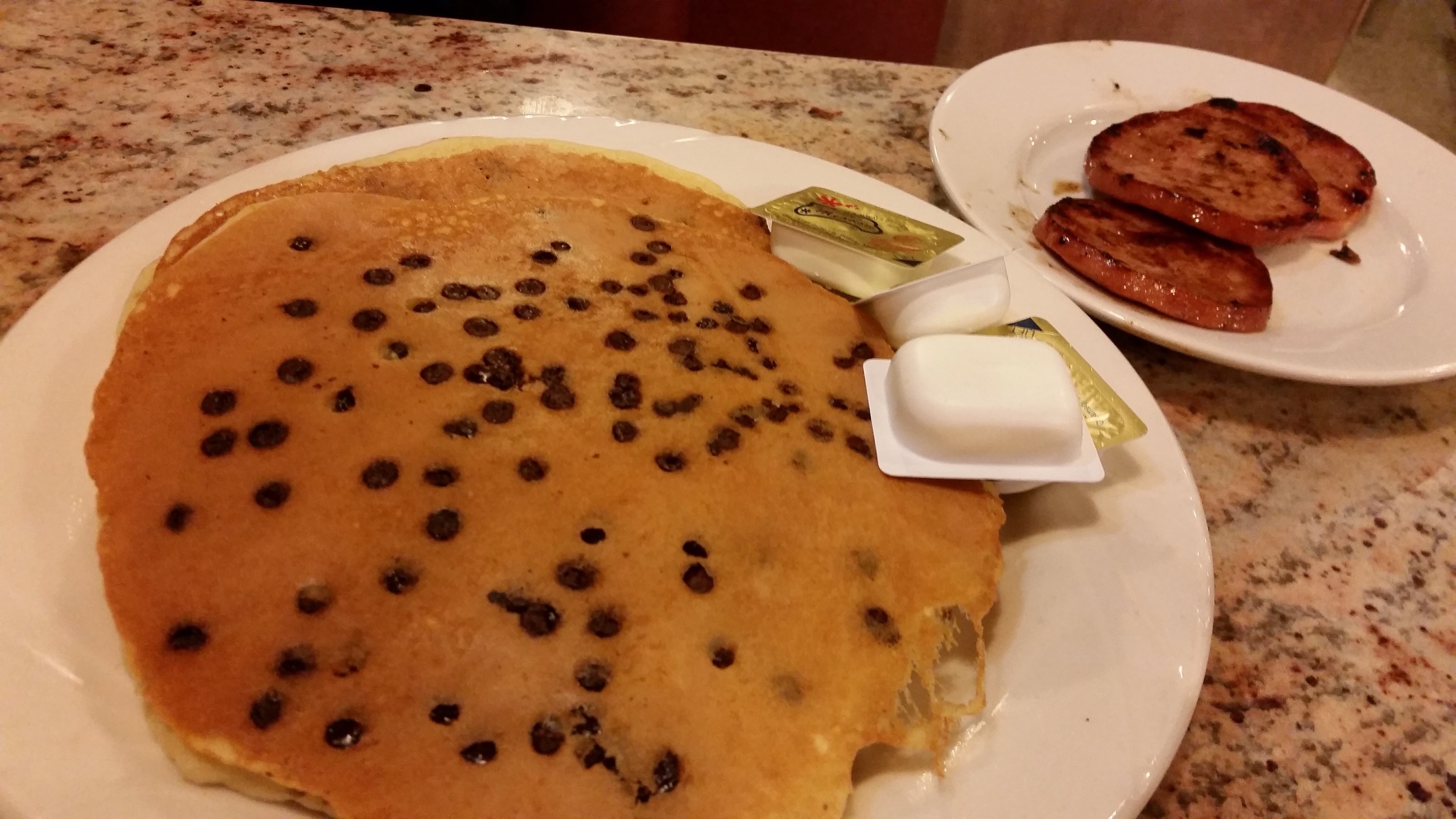 My daughter had the chocolate chip pancake and a side of Canadian bacon. She could not cut into the bacon. She said that they dunk the bacon in grease and grilled it to a hard rock.