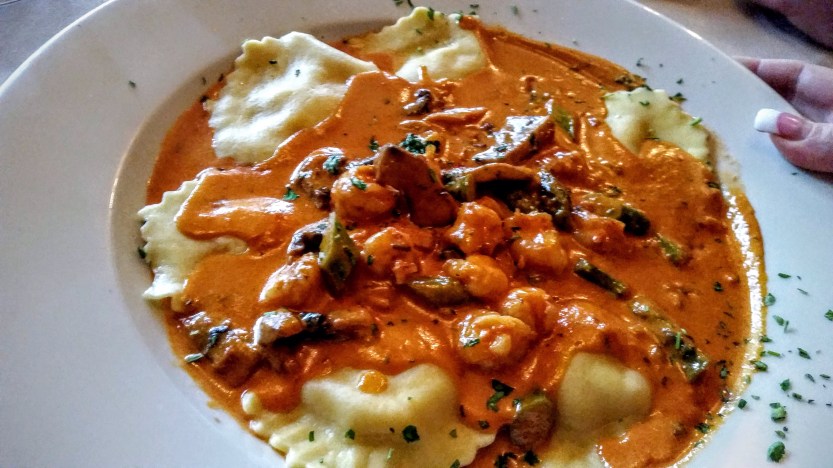 Lobster Ravioli Deana: Cognac infused pink cream sauce with asparagus, mushrooms & diced shrimp