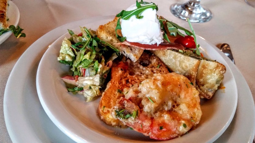 Appetizers: Broccoli rabe & sausage egg rolls, Burrata, shrimps and salad.