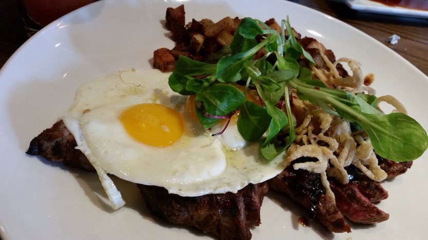 HANGER STEAK & EGGS / char-grilled Hanger with 2 sunny side eggs & potato hash. Best breakfast hanger steak and eggs for me! Perfectly grilled with a crispy char that is tasty enough but not yet carcinogenic. The fried eggs were firmed and runny. My plate was polished clean.