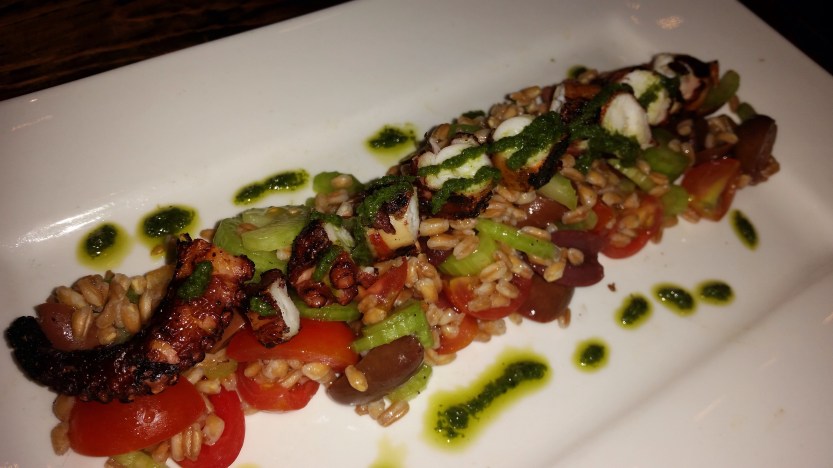 CHARRED OCTOPUS: Farro, olives, celery and cherry tomatoes with lemon vinaigrette and parsley oil. Too few pieces of octopus. The use of Farro threw me off; it took away the octopus. I also think the use of celery is not harmonious with the octopus; the celery stood out. Celery’s crunchiness went poorly with the protein. I love charred octopus and wanted to love this octopus, too.