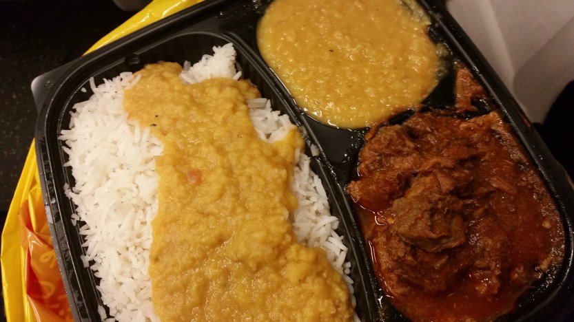 Lamb curry, salad, rice, and dal (lentil). Look at the size of my whole wheat roti! It was super warm after being in the oven for two minutes. What a joy that was.  I had the lamb again on the second try. The yellow dal was drier than the dark but still very yummy. I had a little trouble understanding the young server at the counter asking me whether I wanted the dal over the rice. I made him repeat three times. He was so kind and relaxed that we laughed about it instead.
