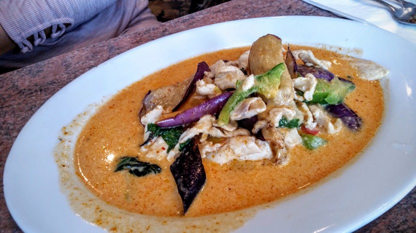 My high school friend, Monica, took me to Thai Village in Princeton, NJ. I have a special connection with Princeton because I spent three years living as a boarder at The Hun School of Princeton and loved every minute of this quaint university town. Since I last lived there, Princeton has become very global and very Asian. I lost count of the Asian restaurants on Nassau Street. Thai Village is the favorite Thai place for Monica. It’s a no-nonsense, looks like a take out joint but is also a sit down place, restaurant. The conversations surrounding us included one on technology startup infrastructure and one on pharmaceutical clinical trial. Monica and I chatted about her photography business, MK Photography, and the pleasure in creating beautiful images. For her, it’s the headshots. For me, it’s the food, nature, far away places, and people.See Me: Crispy egg noodles topped with brown gravy and cooked with shrimps, bamboo shoots, scallions, and straw mushrooms. I ordered this dish largely because of its name. I want you to SEE ME! Chicken with red curry and coconut milk.