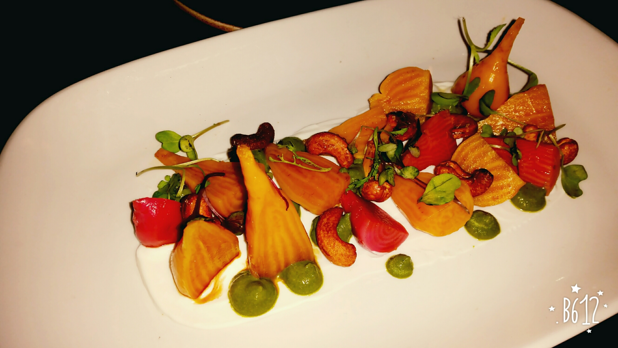 BABY BEETS / smoked / yogurt / candied cashews / herb puree. Interesting plating and concept. Liked the color play but the beets were not seasoned properly. The herb puree did absolutely nothing.